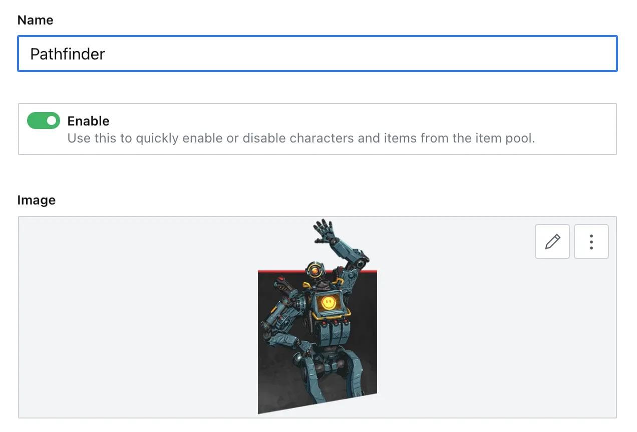 Apex Randomizer version 2 is another project I chose to use Sanity.io for content management. I wanted a quick and easy way to add and remove items from the pool to coincide with the updates that the game developers were making, so I created a boolean (true/false statement) in my schema that I could turn on or off depending on if the character or item was in the game.